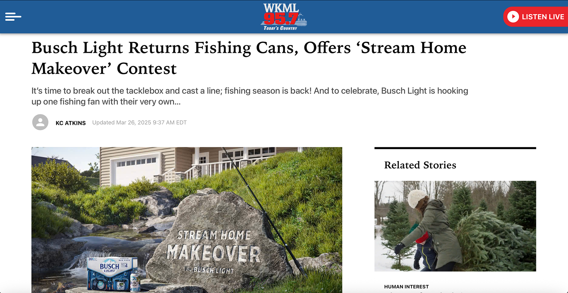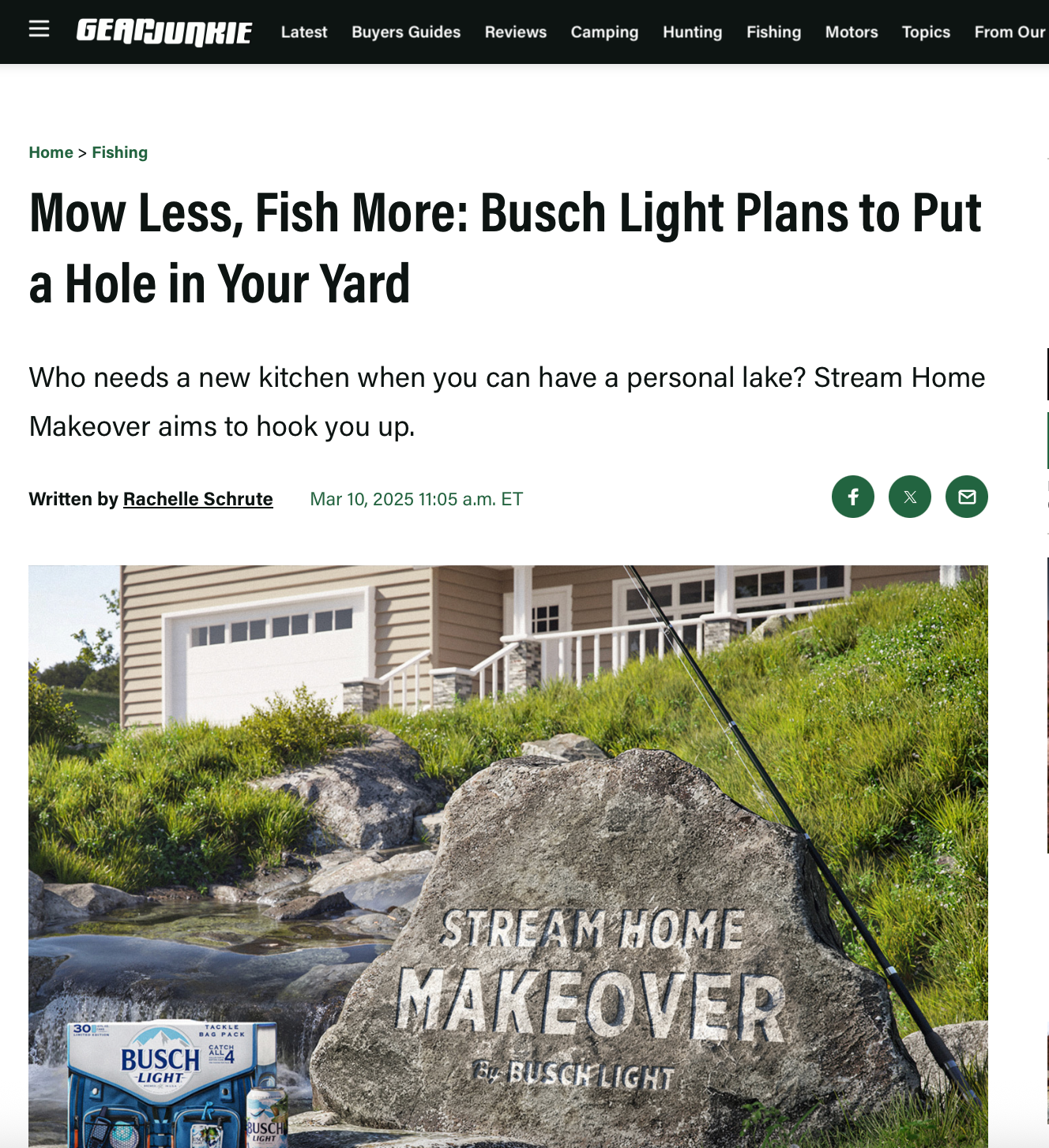 Extreme Home Makeover? Nah, Stream Home Makeover. Did our lawyers really push back on that name? Yes! And was Stream Home Makeover a social campaign for Busch Light where fans to could enter to win a stream in their own front yard? Double yes! A real stream stocked with catchable fish. And drinkable ice-cold Busch Light. Buschhhhhhh!